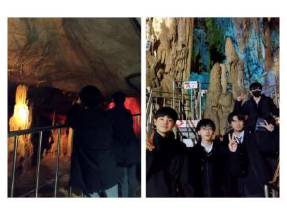 あぶくま洞では、初めて見る鍾乳洞の地形に驚いていた生徒もおり、30分ほどの見学を楽しみました。