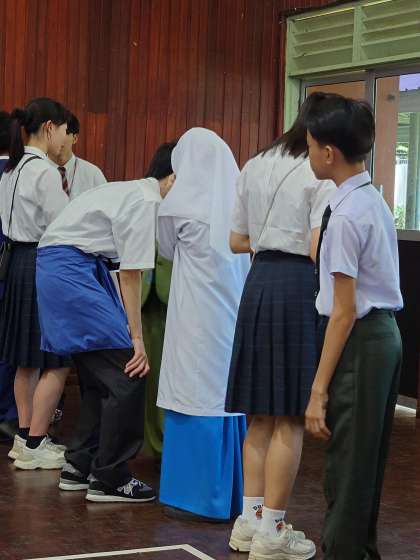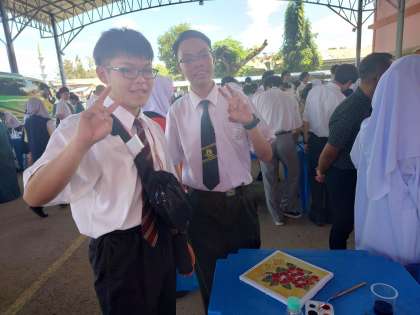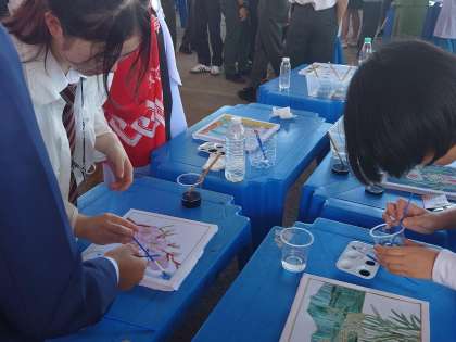 午前中は、現地の高校マクタブサバと交流しました。ムスリムの多いマレーシアでは現在ラマダンの最中で、日中の飲食を控えている生徒が多く、身体を激しく動かすゲームなどはできないながら、日本語を学んでいる生徒もいるということで、見事な日本語を交えての、学校あげての心温まる素晴らしいおもてなしを頂きました。本校の紹介では、委員が中心となってビデオを作成したところ、自由な発想で楽しく美しく仕上がっていて、教員もびっくりしました。バチック染め体験をさせていただき、相手校の生徒さんたちの見事なご指導のおかげで、みんなプロのような出来栄えに仕上がりました。お土産に持って帰ります。そのあとは、日本の遊びである、けん玉、トントン相撲、伝言ゲームで盛り上がって、すっかり仲良くなり、本当に名残惜しく当校をあとにしました。