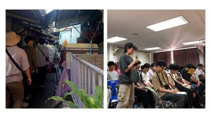 財団の施設に到着するまでに、その地域の幼稚園を訪れ、卒園式に参加させていただき、園児たちと少し触れ合う時間がありました。その後、いわゆるスラム街を通って財団に到着。創設者であるプラティープ先生から直接、財団設立の経緯や意義をお話しいただきました。