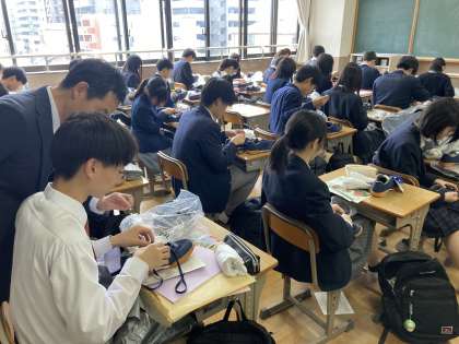 新しいクラスに入り、クラス担任の簡単な挨拶を終えたのちに、体育用品を受け取り、新たな友人と初々しいコミュニケーションを取りながら、真新しい上履きに靴紐を通していました。英語のテストを前に、休憩時間に入学後決定するクラス役員の表を見て、相談する様子も見られました。