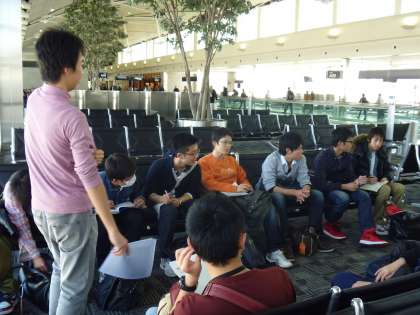 デトロイト空港乗り継ぎ時間を利用しての研修旅行委員会。出発からここまでのうまくいったところ、うまくいかなかったところを話し合っています。どう改善するか、いろんな意見を出し合い、今後に向けて気合を入れています。