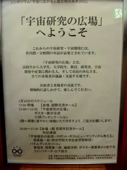 1月10日(土)・11(日)京都大学の100年記念ホールにて,シンポジウム「宇宙にひろがる人類文明の未来2015」が開催され,本校からも2名の生徒が「宇宙研究の広場」にポスター展示発表に参加してきました。