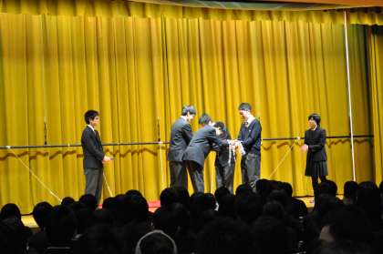 1・2年生からの激励として、まずはじめに生徒会の代表から折鶴が送られ(写真上)、続く統括室長からは、「夢があること」「たくましさがあること」「探究心を持っていること」「生意気であること」「一員であること」という「合格(成功)五箇条」が示されました。