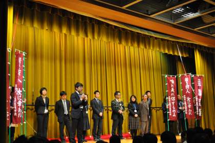 担任団からは、3年前の3月の合格者登校日を振り返る話、「福笹」のご利益の話、人生を化学反応に例える話など、様々な角度からのメッセージに会場は終始笑顔に包まれました(写真中)。