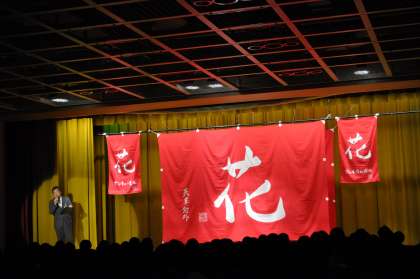 最後に学校長からは、14期生のシンボルである「花」の文字が大きく書かれた4つの旗が送られました(写真下)。大きな2つの旗には「千紫万紅」「英華発外」と記されており、14期生が「花」から「華」へと成長し、それぞれの才能を世の中に役立ててほしいという、学校長の強い思いが述べられました。小さな2つの旗には「サンキュー重圧」「ウェルカム困難」と記されています。この日14期生は、今後向き合うべき重圧と困難に立ち向かう決意を新たにしたことでしょう。