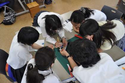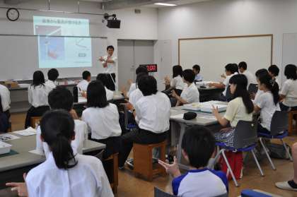堀川高校では,探究活動に興味をもつ中学生を対象に,スーパーサイエンスハイスクール(SSH)の成果を生かした探究的・発展的な特別講義・実習である「探究道場」を年4回実施しています。ある課題に対して,試行錯誤しながら,課題解決にいたる道筋をたどっていく活動をグループで行います。