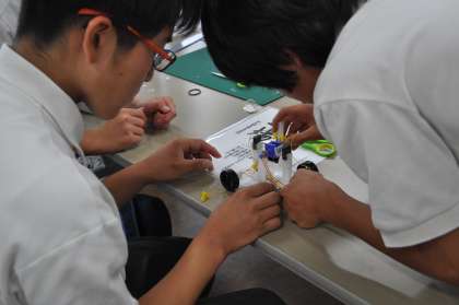 前半は師範から「モーター」に関する簡単な解説を受けた後,各班で,コイルなどの部品を元にモーターを作ります。ここが今回の「道場」の一番の難所。原理を理解することと,実際に組み立てることは大違い。多くの班がモーターのブラシと整流子の調節に苦労していました。中間報告で互いの情報を交流しながら,後半の活動に活かします。後半は主に,モーターの動力を車輪に伝える仕組みを考えました。