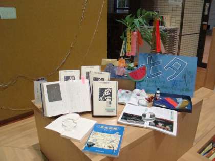 今年も図書委員の活動が活発です。7月7日の七夕をテーマとして、図書委員のディスプレイ班のメンバーが七夕関連図書や笹飾りをアレンジしました。図書館を訪れた人たちが願い事を書く短冊も用意されています。お気軽に図書館にお越しください。