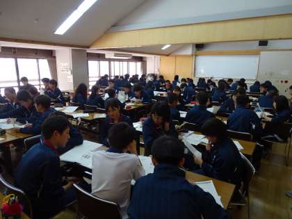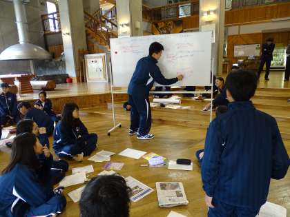学校を9時30分に出発し、花背山の家には10時半過ぎに到着しました。到着後に開講式を行い、昼食をとり13時15分から探究活動をおこないました。3つのテーマに分かれて、それぞれのグループで課題を具体化し、その解決方法を設定、その施行、結果の評価、見直し、方法の再設定などの活動を繰り返し、一定の仮説と検証方法がかたまったら、ポスターを作成しました。明日の午前中に発表します。