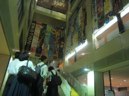 垂れ幕は、堀川高校に入るとすぐ目の前に現れ、みなさんを出迎えます。クラスごとに作ってきた講堂劇やアトリウムパフォーマンスの世界観がそれぞれの垂れ幕に現れます。