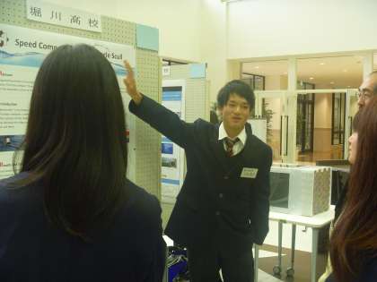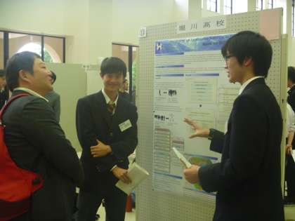 関西学院大学の学生・院生の研究 25テーマ、全国17高校の課題研究 45テーマのポスター発表が行われ、大学教員や大学生・院生、高校の教員や生徒から活発な議論がなされました。堀川高校からも 吉田晏大くん、呉侑樹くん、山下唯くんが英語でポスターを作成し、英語で内容説明をしました。他校の先生方、大学の先生方からたくさん議論していただき、よい部分にも問題点にも気づけるよい経験になったのではないかと思います。