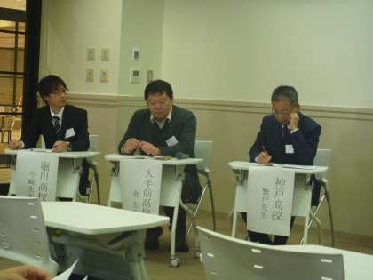 教員向けの「課題研究に関する意見交換会」も同時に開催され、課題研究テーマ設定における課題について神戸高校、大手前高校、堀川高校の教員が事例を紹介しました。「部活動との兼ね合いはどのようにされていますか」や「大学では知識がある上でテーマ設定するが、高校ではどうしていますか」などの質問があり活発に議論されました。
