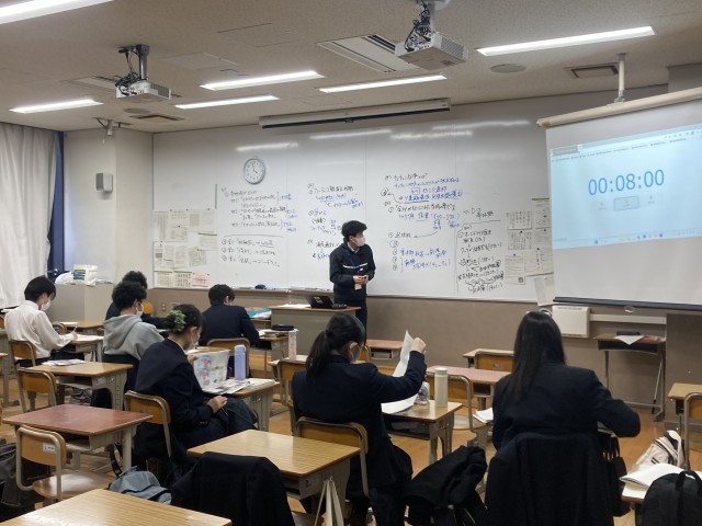 堀川高校では、今年度から、黒板とホワイトボードの両方を活用しています。ホワイトボードは、書き直しが簡単なので、数学や地歴公民の授業で、たくさん板書をする先生にも便利です。以前に学校説明会のアンケートで素朴なご質問をいただきました。「教室の天井近くの部分はどう使うんですか?」確かに、その部分は活用しきれていませんが、黒板の縦幅よりも広がり、白地にカラーペンで書けるため、複雑な内容も見やすく整理できるようになったかと思います。英語の授業では、生徒に英作文を書きに出てきてもらう際、黒板だと多くて3人ほどでしたが、一気に4人、、、いや詰めれば5人ほど出てもらえます。生徒たちは、おそらくさらにうまく使っていて、放課後、文化祭の時期、探究活動をしているとき、など、複数で同時に書きながら自由な発想を伸ばしているように思います。チョークの粉が出ないのも利点です。