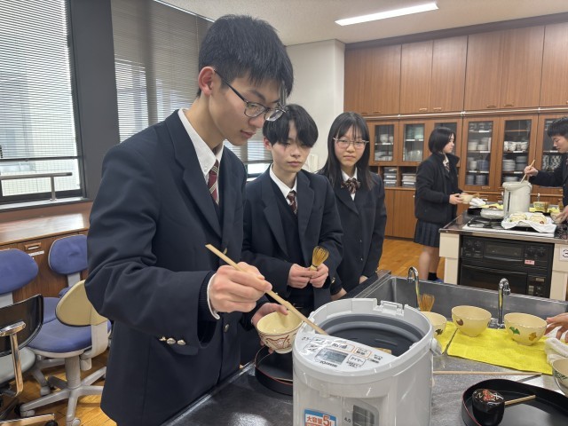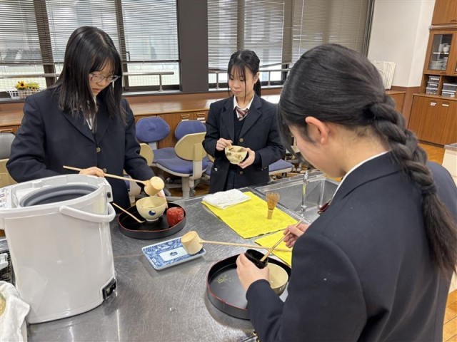 27期生(1年生)が家庭科の授業で茶道体験を行っています。これは、京都市教育委員会からの支援で実現しているもので、市立高校生が、自国の伝統文化を知り理解し、他国の歴史や文化を理解し尊重する態度を育むための学びの機会の1つとなっています。