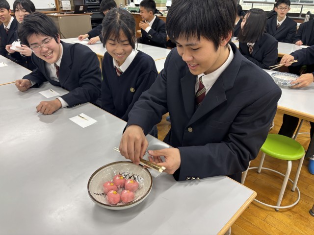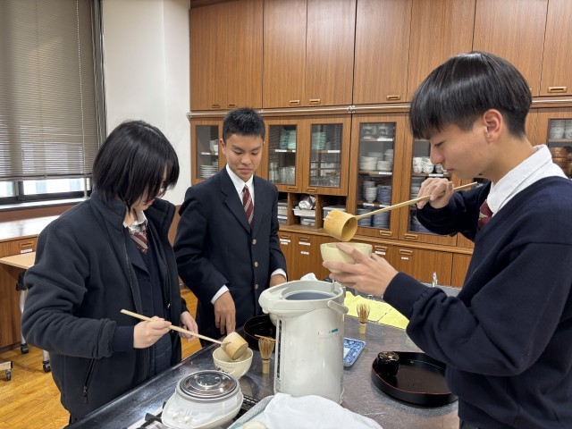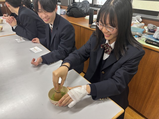 生徒たちは講義やビデオから、伝統文化やお抹茶の点て方などを学び、いざ実践。生徒一人ひとりが、お抹茶を点てて、グラスメイトに振舞います。お抹茶と一緒に和菓子(今回は「梅の雪」)を美味しく頂きました。生徒たちは、「初めてお抹茶を点てみて、難しいと感じた」や「お抹茶と和菓子がおいしい」「心が落ち着いて感じがした」などと言った感想を言ってくれていました。
