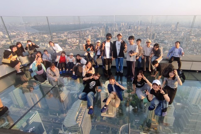 夕方からはマハナコン最上階の展望台に向かい、バンコク市内の景色を眺望しました。マハナコンの展望台は高さが314メートルのバンコクで一番高い高層ビルで、展望台から突き出たスカイフォークは、世界最大のガラスの床となっています。最初は恐る恐る歩いていた生徒たちも、すぐに笑顔で足下の景色を楽しんでいました。360度パノラマでバンコクの街を見下ろし、日が暮れていく様子を眺めました。