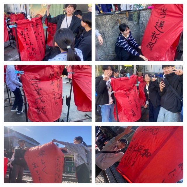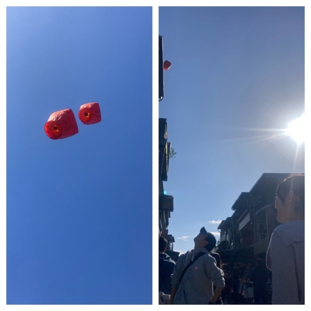 十份は山深い場所で、清朝時代に盗賊の襲撃が終了した合図としてランタンをあげていた習慣が文化となり、願いを届ける灯篭上げが有名な観光地となっています。到着後、流れるように誘導され、灯篭の四面にそれぞれの願いを筆で書きました。家族の長生き、幸せな人生、◯◯模試20位以内など、十人十色の願いに加えて、この宿泊研修の全体テーマ「一灯照隅」も大きく書いた11個の灯篭は、昨日までの小雨が嘘のように快晴の空に吸い込まれていきました。