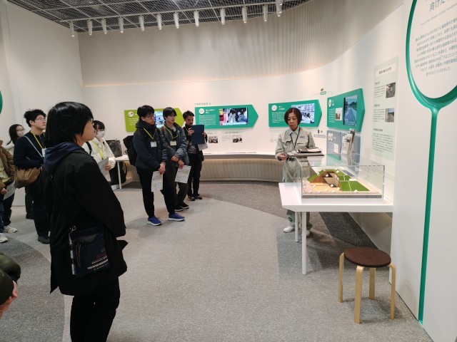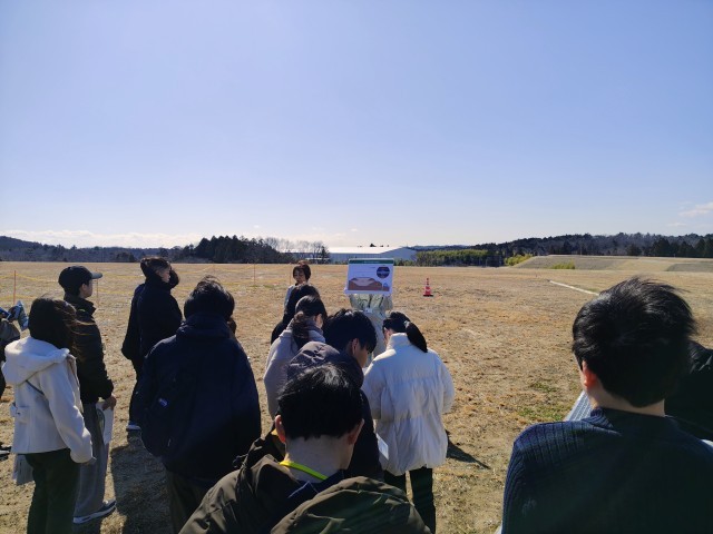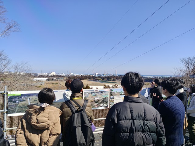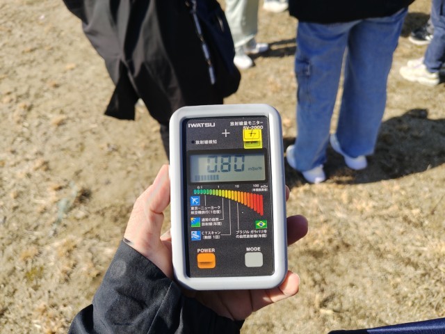 午前中は除染により発生した除去土壌を安全に処理し、一時保管をしたりこれらの土壌の再利用の実証実験を行っている中間貯蔵施設を見学しました。見学コースでは廃炉処理中の福島第一原発を遠くに眺めたり、原子力災害の制限地区に入ったため、被災当時のまま時が止まった手つかずの特養施設を見学したりと、当時の緊迫した状況が伝わる遺構を巡ることができました。除染区域には線量計が設置されており、安全は確保されていますが、原発に近づくと線量値が上がるなど目に見えない放射線との戦いの難しさを感じる見学ともなりました。除去土は最も被害を受けた原発隣接市町村にすべて集められ、すべてこれらの地域が負担を一手に負っています。2045年3月までにすべて県外処分すると法律で決まっていますが、候補地の反対運動が起きるなど未だに処分地は決まっていません。社会課題の解決の難しさに気づくことができました。