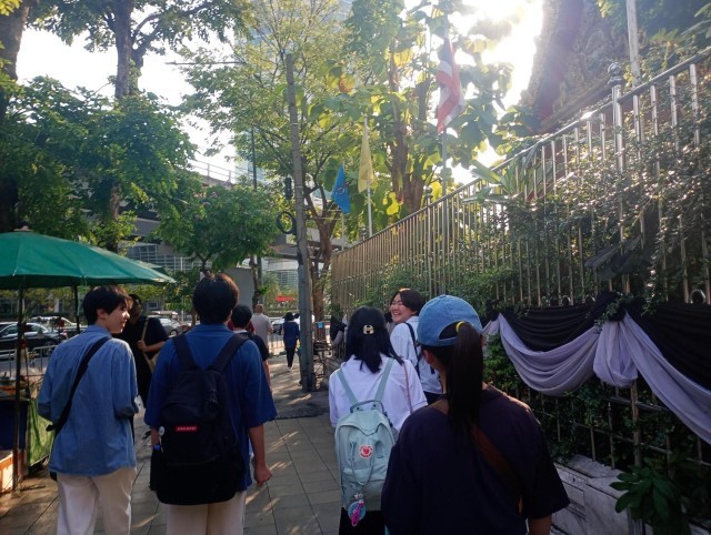 本日午前中はB&Sプログラムによる班別学習です。現地大学生が1班に1名ついて、班ごとにバンコク市内をフィールドワークしました。昼食場所も含め、事前にどこに行きたいのか班ごとに計画はしていますが、朝に現地大学生と打合せを行い行程を伝えます。
