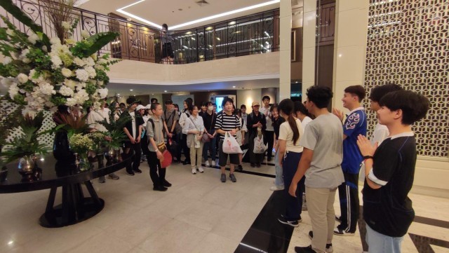 ○写真1:班別研修に出発する様子 ○写真2,3:ホテルロビーにて帰館した班の様子