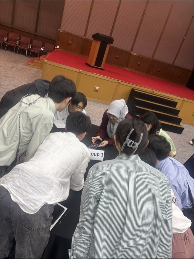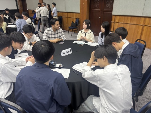 オールイングリッシュで助け合い、大学生にも助けられながら懸命に話していました。しおりなどに意見や質問をたくさん書き込み、準備した成果も出ていたと思います。仲良くなれたと喜ぶ声も印象的でした。