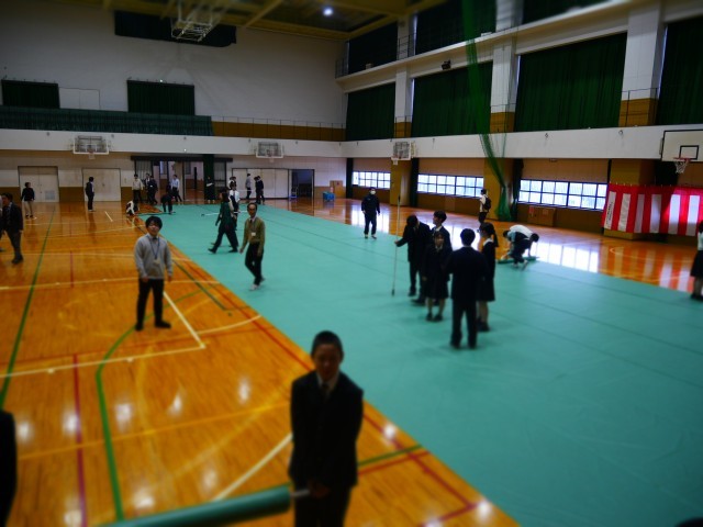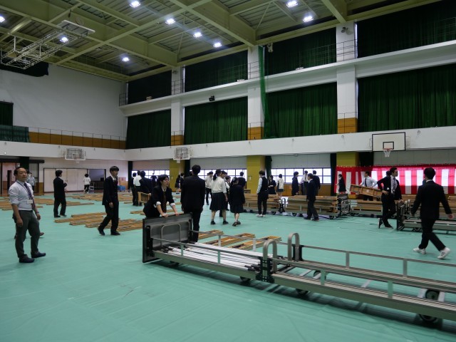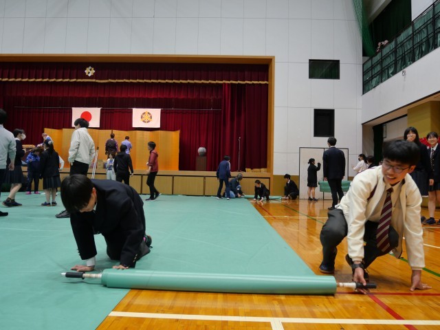 4月8日(水)の入学式会場となる4階アリーナの準備を、26期生(新3年生)、27期生(新2年生)の陸上部、女子バレーボール部、生徒会執行部、その他有志の生徒たちと教職員で力を合わせて行いました。このような作業をする際は、たくさんの人が協力しあって進めることが何よりも大切だとあらためて痛感します。生徒のみなさんありがとう。