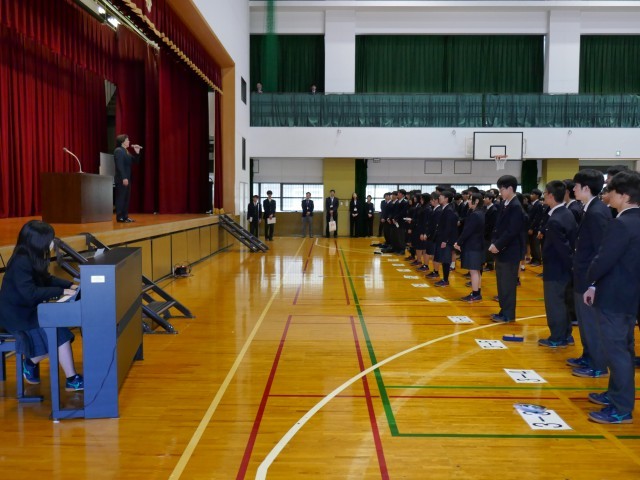 26・27期生が両側から拍手する中、28期生が入場しました。始業式に先立ち、芸術科音楽の田中先生から、校歌指導がありました。先生は、HOP: 先生の歌うのを聞く、STEP:実際に自分で歌ってみる、JUMP: 始業式の中で校歌斉唱する、の3段階で指導されました。ブレス(息つぎ)を大切にして、夢と希望をもって歌うように、とのお話でした。緊張していた28期生も、先生のユーモアたっぷりの進行に、笑顔がこぼれていました。