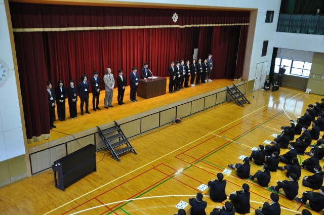始業式では、まず新転任の先生方の紹介がありました。次に、昨年度以降で全国的な活躍のあった生徒たちが紹介されました。中でも26期生の2名は、自らの活動内容や思いを語ってくれました。高校生ビジネスグランプリ最終審査会に進出した生徒は、ビジネスはお金を稼ぐだけでなく、持続可能な成長へつなげるものでもあるし、世間から期待されている堀高生は、使命感をもって社会的意味を追求すべきだと言いました。また、「科学の甲子園」で全国10位になった団体の代表者は、今回は経験の差があったが、27・28期生にはいろいろなコンテストに果敢に挑戦してほしいと話してくれました。