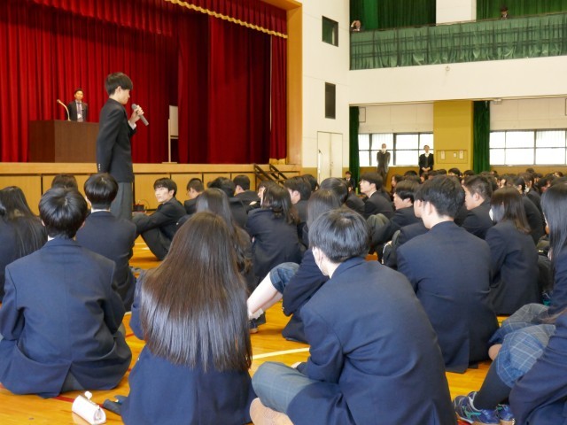 このあとは、生徒会執行部が中心となって、対面式が行われました。まずは新入生代表のあいさつ。「私たちは、学校説明会などの行事や探究活動での先輩の姿に圧倒されて、堀川高校を目指しました。私も、学習と探究の二兎を追いたいです。3年間で、自己を確立し、自らを律する、「響」という言葉に負けない存在になりたいです。」
