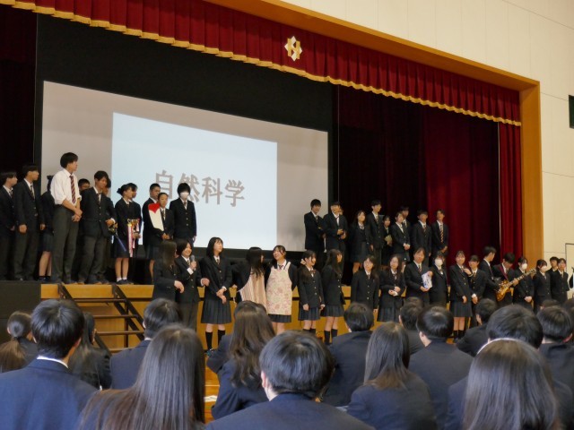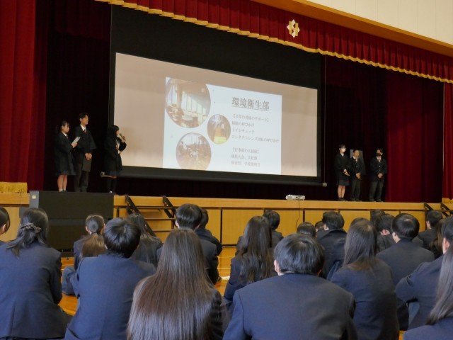 最後に、生徒会の部会の紹介と、部活動紹介がありました。生徒会部会は、文化部長、体育部長、環境衛生部長、クラス活動部長、装飾部長の5人が、それぞれの部について説明をしました。部活動は次の24種類。英語、茶道、食物、演劇、電算機研究、美術、吹奏楽、軽音楽、邦楽、放送局、文芸、陸上、男子バスケットボール、女子バスケットボール、テニス、バドミントン、ボート、剣道、男子バレーボール、女子バレーボール、山岳、女子ソフトボール、硬式野球、サッカーです。28期生も自分に合ったクラブ活動を発見し、挑戦できるといいですね。