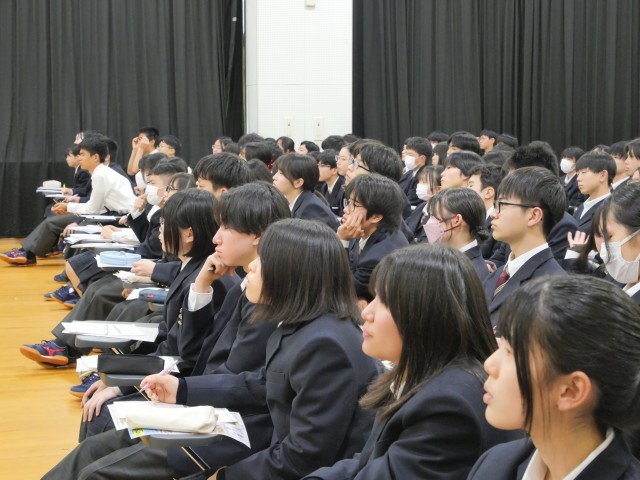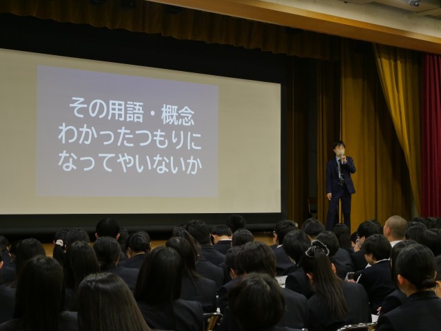 また、1年生は、来週からの授業開始に向け、国語・数学・英語・地歴公民科・理科の教員から、第1回学習オリエンテーションがありました。「難問を頭の中で飼う」「まとめる、つなげる、広げる」「人に咀嚼してもらわず、自分で教科書を読み砕く。トップランナーにはそもそも教科書すらない。」などなど、教科担当から想いが語られ、1年生は一人ひとり気づきをメモしていました。
