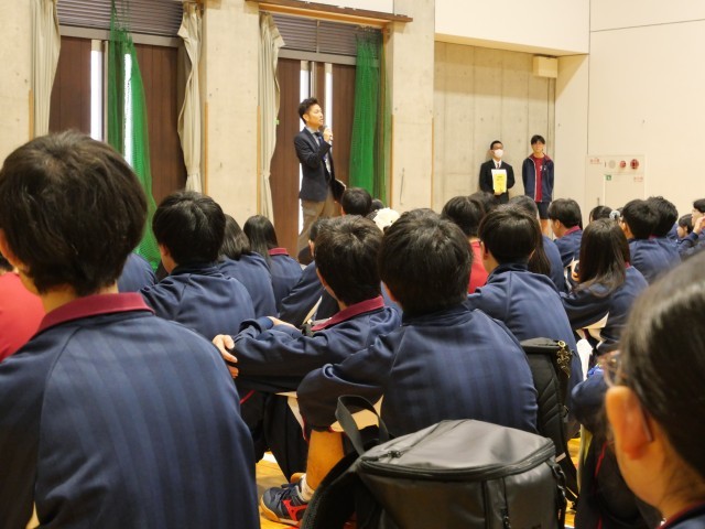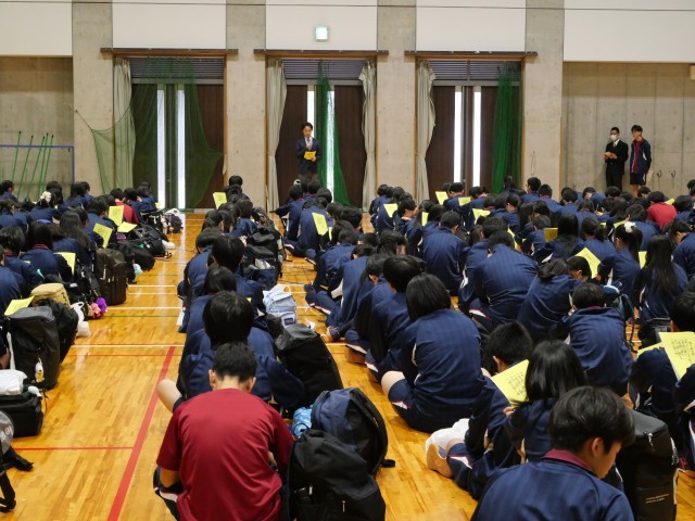 1日目の今朝、2名の生徒の司会の元、開講式が実施され、教員、代表生徒からのメッセージが伝えられました。船越校長先生からは、「DIVEの意味とは何か。『飛び込む』、『水の中に潜る』、という意味もあるが、観念的、概念的な意味では、『没頭する』、『没入する』、という意味がある。2日間この取組に積極的に没頭してほしい。また、失敗を恐れずに挑戦する気持ちを持つとともに、仲間と一緒に頑張る雰囲気作りを大切にしよう。28期生は「響」、奇跡あって出会った28期生が、大きな声の生徒も、小さな声の生徒も、みんなの会話が響き合い、反響すれば、互いの関係性の質が向上するだろう。堀川高校生活の入り口として、良い時間にしてほしい」との話がされました。続いて研究部長の飯島先生からは、探究五箇条が一つ一つ読み上げられたうえで、「特に、『手と頭を動かせ』『朋と愉しめ』を大切にしよう。頭で考え、実際に手を動かして実験、検証をする。この2日間はスマホは必要ない。クラスメイトと一緒に手と頭を動かしてほしい。音を響かせようと思うなら、まず自分が何らかの音を発さなければならない。自ら行動することを大切にしてほしい」との話がありました。探究係のリーダー生徒から探究活動の流れの説明があったのち、最後に、探究DIVEの全体リーダーの生徒から、「目的は、『つながりを作ること』、そして目標は、『仲良くなること』、『議論すること』『探究のやり方を知ること』を大切にしよう」との話がありました。