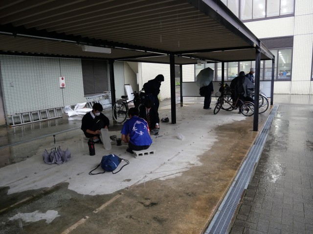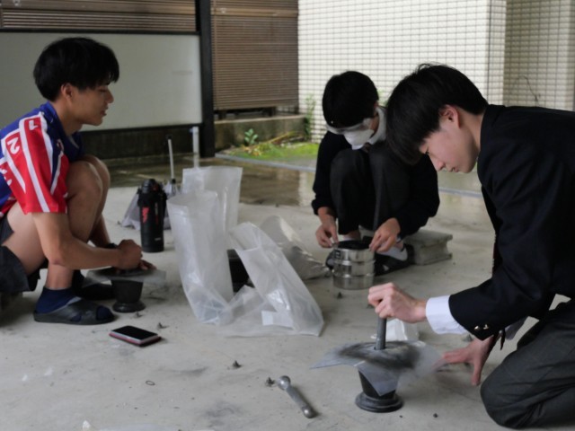 本日は、本能館探究DIVE1日目で、1年生は15時半ごろまで、堀川高校での初めての探究活動に取り組みました。その帰り、自転車登校の1年生が自転車置き場に行くと、「カンカンカンカン…」という高い金属音が。雨除けの屋根のある1年生の自転車小屋で、3人の先輩たちが、石鉢のようなものに粉を入れて、ひたすら叩いています。