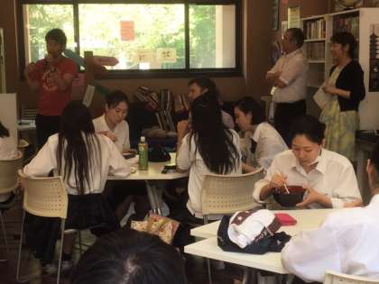 During the lunch time of the 25th, there was an opening ceremony. First, Kris, the HELLO Village Mayor, Mr. Furuike, Principal of Hiyoshigaoka SHS, and Mr. Segawa, the student vice chairperson of the HELLO Committee delivered wonderful messages to the students and teachers there, who were so excited.