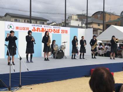 11月24日(土)に,東山区民ふれあいひろば2018が東山開睛館グラウンドで実施されました。これは,東山区民,子どもからお年寄りまで皆が集まる区民最大のイベントです。開会式では,本校1年次生の小松美結さんが,高校生代表としての開会宣言を行いました。また,オープニングの舞台コーナーでは本校吹奏楽部が演奏を行いました。リズム感たっぷりの演奏で,華やかにオープニングを飾りました。また,英語村ブースの出展も行いましたが,英語村ブースではボランティア生徒とALTとで協力して英語を使ってのゲームを行いました。ゲームの参加は小さい子供たちが中心でしたが,中学生や年配の方たちもたくさん参加してくださり,英語でのゲームに皆楽しんでくれました。穏やかな一日で東山区民の親睦がさらに深まった良いイベントとなりました。