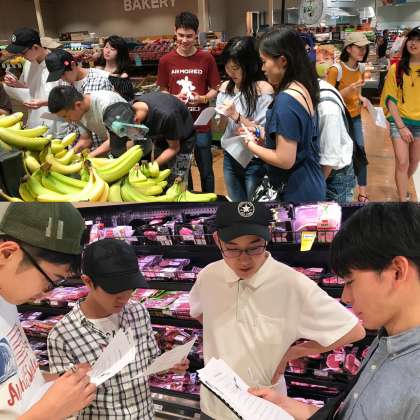 英語レッスンでは、近くのスーパーマーケットに行き、フィールドワークを行いました。課題はグループごとに広い店内を回りながら、先生から出されたいくつかの英語の質問に答えることです。メンバーと協力し、時に買い物客や店員さんに尋ねながら、全てのチームが課題をこなすことができました。