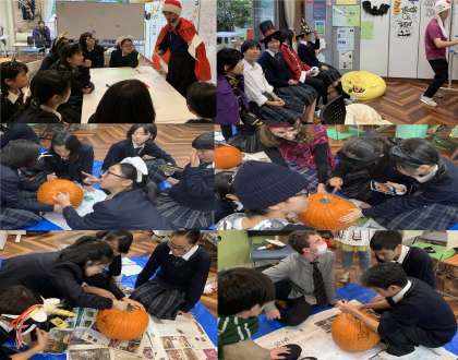 メインイベントは、恒例のジャック・オー・ランタンづくり。生徒たちは自分の顔の何倍もある巨大なかぼちゃを前に苦笑い。その大きさに悪戦格闘しつつ、かぼちゃに顔を描いて、大騒ぎでかぼちゃの中に手を突っ込んでいました。その努力の甲斐あって、個性的なジャック・オー・ランタンがいくつも生まれました。