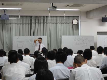 国語の解説では、全員起立し、問題の本文を読み内容を把握した後、問題本文の読み方、記述解答の探し方などについて、講師の堀川高校の先生の講義を受けました。参加者にはノートが配られ、模試の復習でするべきことを教えていただきました。