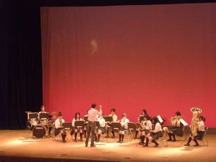 吹奏楽部の演奏で始まり、生徒会文化委員長の開会宣言、学校長挨拶、生徒会長挨拶に続き2年4組「キーチーとチョコレート工場」、2年9組の「日吉本新喜劇」の発表がありました。