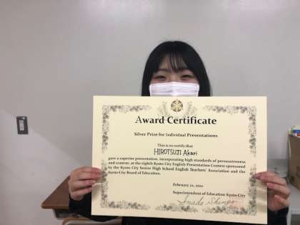 廣辻󠄀さんは「賞はもちろん嬉しいが,それ以上に,このコンテストを通して自分が伝えたかったことを多くの人々に聞いてもらえたことが嬉しい。」と話してくれました。両プレゼンテーションともに,日本や世界の課題に触れ,それぞれの視点で解決法を発表しました。英語の流暢さはもちろん,内容も優れており,感銘を受けました。自分たちの考えや思いをプレゼンテーションを通して発信することの重要性を教えてもらいました。