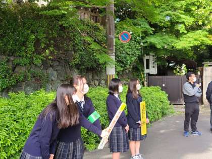 5月10日(火)の朝、東山警察署・東山区役所の方々と本校生徒会執行役員1、2年生で、春の自転車交通安全啓発・挨拶運動を行いました。
