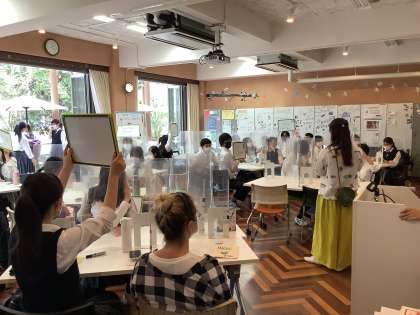 HELLO Village Week2日目は,音楽に関する様々な問題に挑戦する「Music Quiz」が開催されました。生徒たちはチームごとに分かれ,チームメイトと協力してALTのエイスリンさんとジェシカさんから出題される問題に答えていました。生徒が挑戦したクイズをいくつか紹介:曲の一部を聞いてタイトルとシンガーを答える「Guess the Song」,与えられた言葉をタイトルに持つ曲を答える「Song Association」,曲の一部を聞いてジャンルを答える「Guess the Genre」など。生徒たちはクイズに出てきたお気に入りの曲を一緒に歌ったり,ピアノを演奏したりして楽しい時間を過ごしていました。