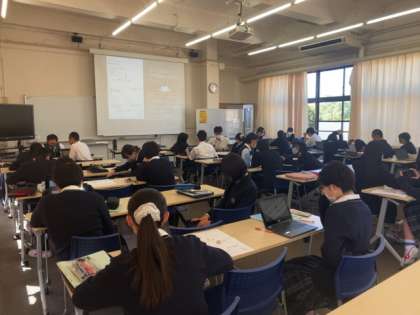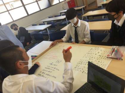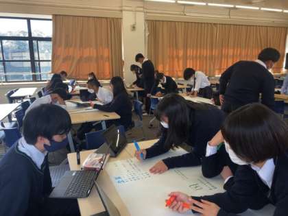 10月21日(金)1,2限(1,2組)は,「サスティナブルな食やファッションを実現する」をテーマに,実現可能で他の人の共感が得られるようなアイデアを班で出していきました。今後,出てきたアイデアを組み合わせて新結合を作るために、出したアイデアを模造紙にまとめていきました。生徒たちで話し合って、色分けや付箋を使って工夫しながら,整理していく姿が見られました。