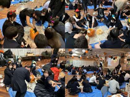 イベントの後半は恒例となっているジャック・オー・ランタン作り。生徒たちは巨大なかぼちゃを相手に悪戦格闘しつつ,かぼちゃに思い思いの顔を描いて中をくりぬいていました。その努力の甲斐あって、個性的なジャック・オー・ランタンがいくつも生まれました。イベントの最後には、ロウソクでライトアップされたジャック・オー・ランタンと一緒に記念撮影をして、ハロウィンイベントは終了しました。