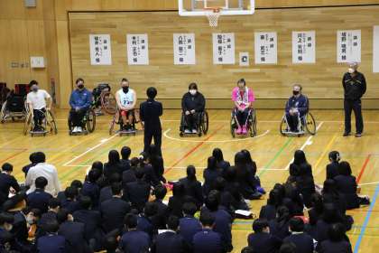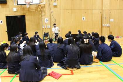 試合の後には、講師の方のお話をグループに分かれて聞かせていただきました。車いす生活を送るようになった経緯や、車いすバスケットボールとの出会い、生徒たちへのメッセージ等、お話し下さいました。生徒は熱心に耳を傾け、様々な質問をするなど、双方向の交流となりました。