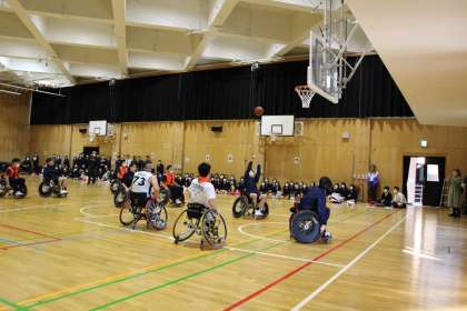 体育館では、まず始めに競技の説明を受け、選手の方の模範試技を見ました。その後代表生徒により、クラス対抗で車いすバスケットの試合をしました。中々思うように動けず、いつものバスケットボールのゲームならスムーズにできているはずの、パスを受け取る、シュートを打つなどの動作の難しさを実感しながらも真剣に戦い、応援生徒も一体となって大変盛り上がりました。