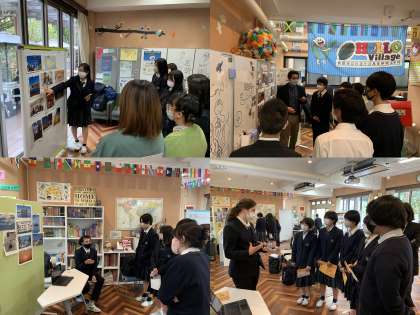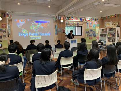 HELLO Village Week II 3日目は「Ekkyo Poster Session」が放課後に行われました。8人の発表者が二つのグループに分かれ、様々な越境体験について話してくれました。ALTのハロルドさんは旅することの重要さについて,アナスタシアさんは日本に来て受けたカルチャーショックについて発表しました。現在日吉ヶ丘で学んでいる留学生の3人はそれぞれ自分の生まれ故郷であるインディアナ州,メイン州,カルフォルニア州について話しました。日吉ヶ丘の生徒二人はカナダへの留学,そして宮崎県の都農町で行ったフィールドワークについて発表しました。そして,日吉ヶ丘の卒業生がアフリカのスラム街などを訪れた時の体験などについて話しました。どのポスターセッションも人気で,集まった生徒たちは興味深い内容にうなずきながら聞いたり,疑問に思ったことは最後のQ&Aセクションで質問したりしていました。