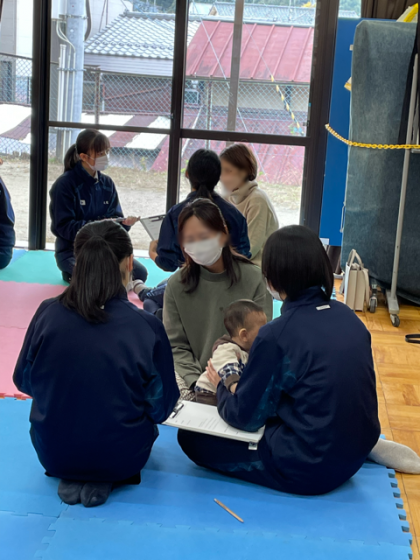 乳幼児さんとふれあい、お母さん方からは出産、子育ての喜びや大変さ等のお話を伺うことができました。また、民政委員さんより妊婦体験や,保育人形のおむつ替え指導も受けました。将来、子育てや幼児教育に携わる際に役立つ貴重な体験になりました。