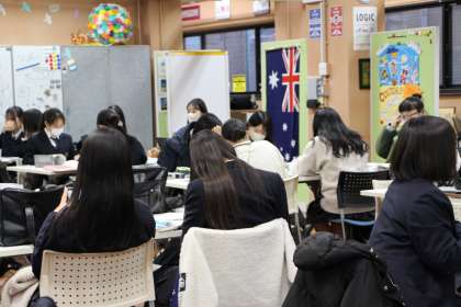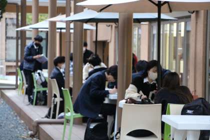 冬の日だまりがことのほか暖かく感じる今日この頃、放課後は厳しい寒さにも関わらず、英語村の中と外のテラスでは、多くの生徒が考査に向けて熱く奮闘中、寒さを感じさせないHELLOVillage(英語村)の風景です。(広報情報部)