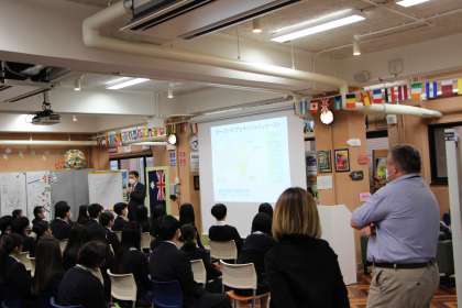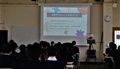 キャリア教育の一環として自分が今興味を持っていることを将来どのように繋げ,また社会や世界とどう関わっていくかについて考える機会とすることを目的に外部より講師を招いて3つの講演を用意しました。生徒は自分の興味に基づき,その中から一つを選び各講演に参加しました。